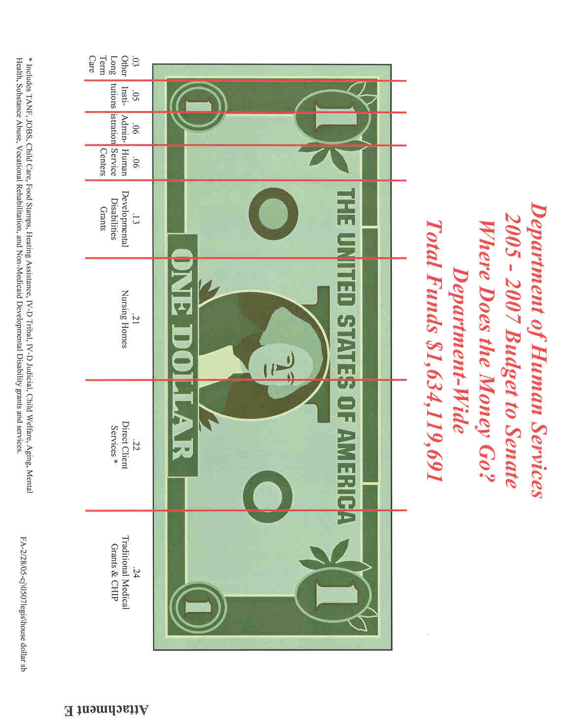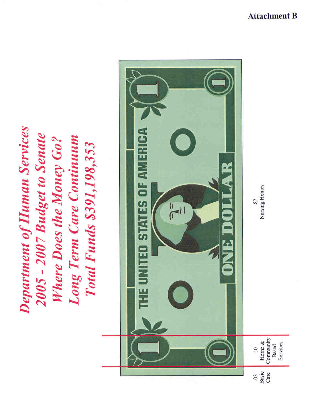 Lastly, I would like to direct your attention to Attachment E (112kb jpg). Just as we did last session this attachment displays "Where the Money Goes" in the Department. As you can see over 80% of this budget goes directly "out the door" as Carol Olson previously mentioned in her testimony. Another 11% is used to provide direct services to clients through the regional HSCs or the Institutions.